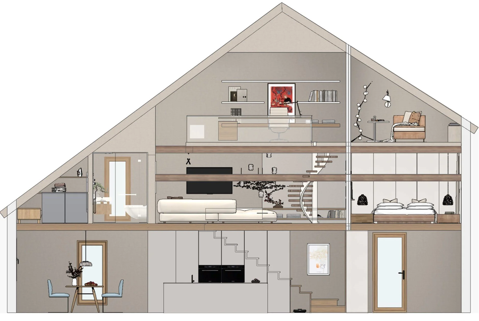 Diese Scheune, die an das Hauptgebäude angegliedert ist und in "Einliegerwohnung" umgewandelt wurde, verfügt über 87 m², die sich auf drei Ebenen verteilen.Die ursprüngliche Struktur der Holzbalken des Gebäudes wurde teilweise freigelegt. Jeder Millimeter wurde genutzt, um genossen zu werden, und es wurde eine Anordnung geschaffen, bei der der Raum und das natürliche Licht im Vordergrund stehen.
